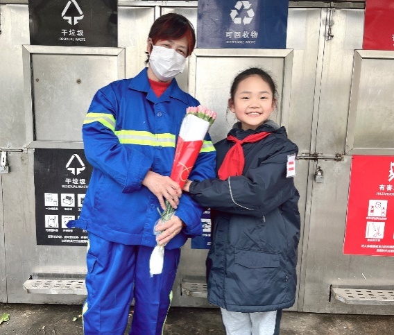 上海市虹口區(qū)第四中心小學(xué)的楊綰心經(jīng)常看到家附近的社區(qū)環(huán)衛(wèi)工人張奶奶,新年到來之際,她去看望了張奶奶,并送上了龍年祝福。張奶奶今年已經(jīng)58歲,始終堅守著崗位,主動加班加點。楊綰心把一束鮮花送給張奶奶,也向環(huán)衛(wèi)工人的辛勤付出和默默奉獻(xiàn)致敬。她說:“我們應(yīng)該一起為環(huán)衛(wèi)工人點贊,也要學(xué)習(xí)他們的勤勞和無私奉獻(xiàn)。”