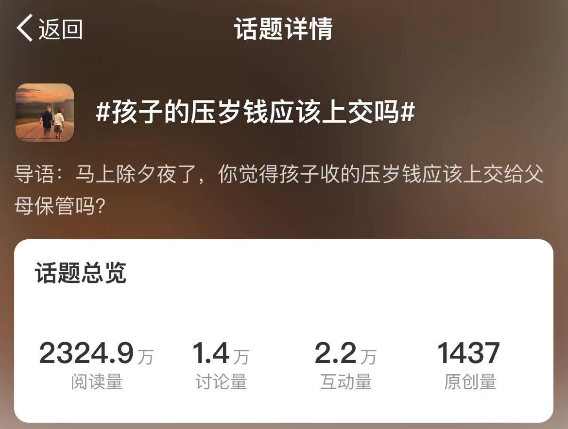 過完年,孩子們收到的“大包小包”壓歲錢怎么支配?“我們先幫你保管,等你長大了再還給你。”這樣的話你是否耳熟?近年來,隨著壓歲錢金額的逐年上升,#孩子的壓歲錢應該上交嗎#等話題也由此頻頻引發熱議。今年春節期間,杭州一位三年級小學生攢下70萬壓歲錢的消息就沖上熱搜,引發更多人對于管理壓歲錢的思考。