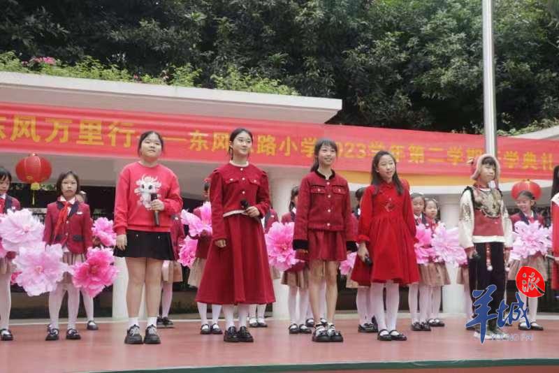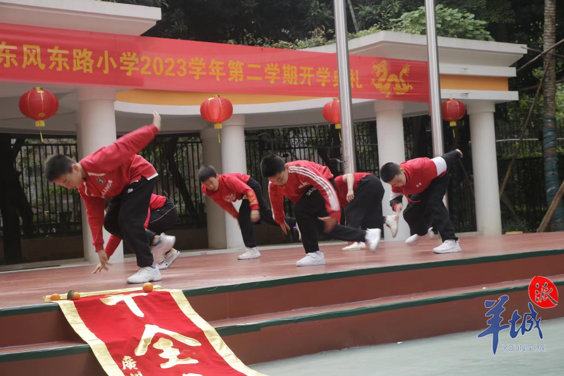 臘盡春回, 2月20日,廣州市越秀區東風東路小學迎來開學典禮。濃郁的氛圍自上學路就已開啟,孩子們身著紅色的古典的衣裳,頭戴手工制作的龍頭飾,踏著鑼鼓聲進入校門。