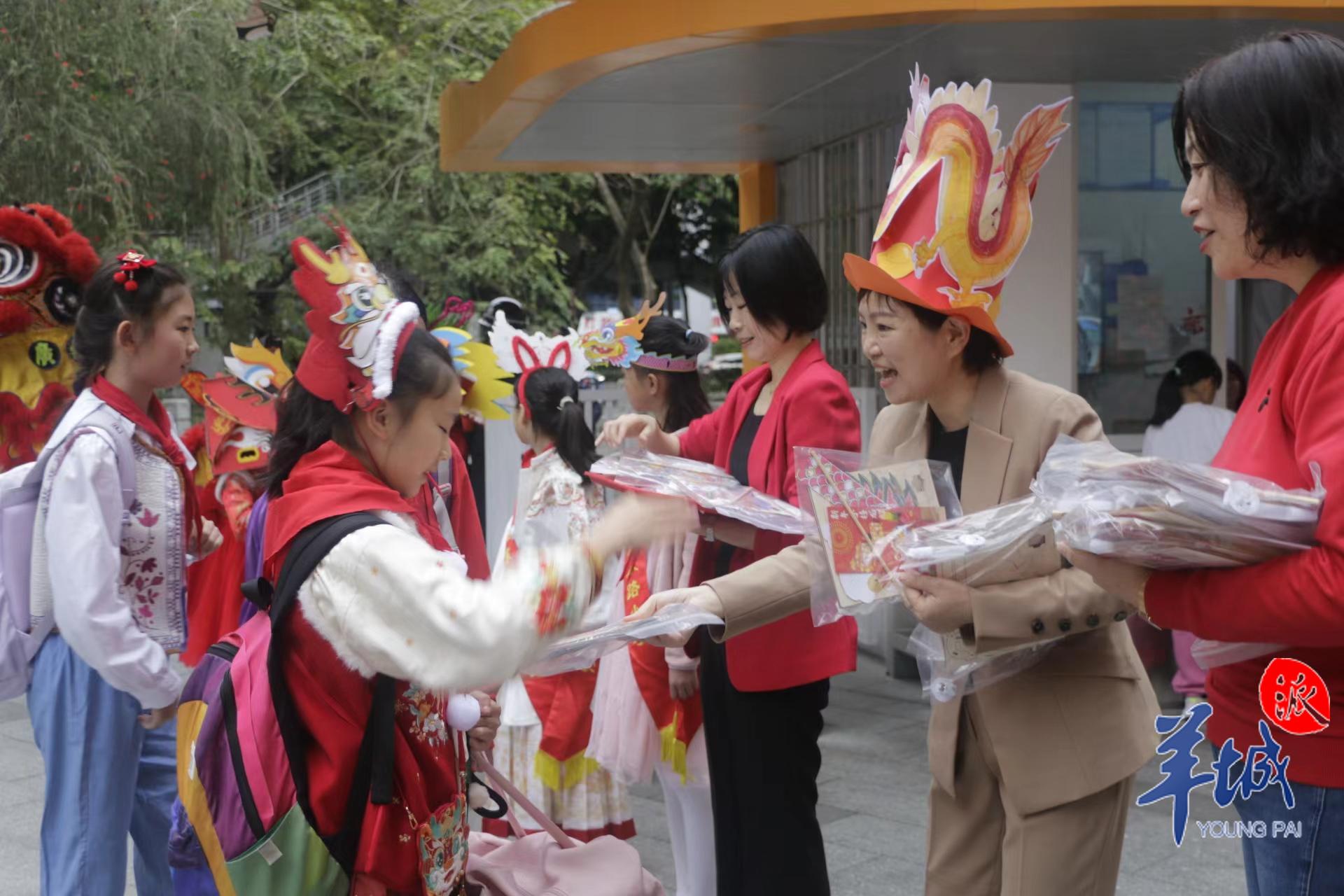 老師、少先隊的同學和舞獅隊早早就在此等候。有的同學戴著罩滿整個腦袋的龍頭飾,笑盈盈地沖向老師們,老師親切地問候同學,并遞出新年禮物“福祿壽禧龍”,給同學們送上祝福。