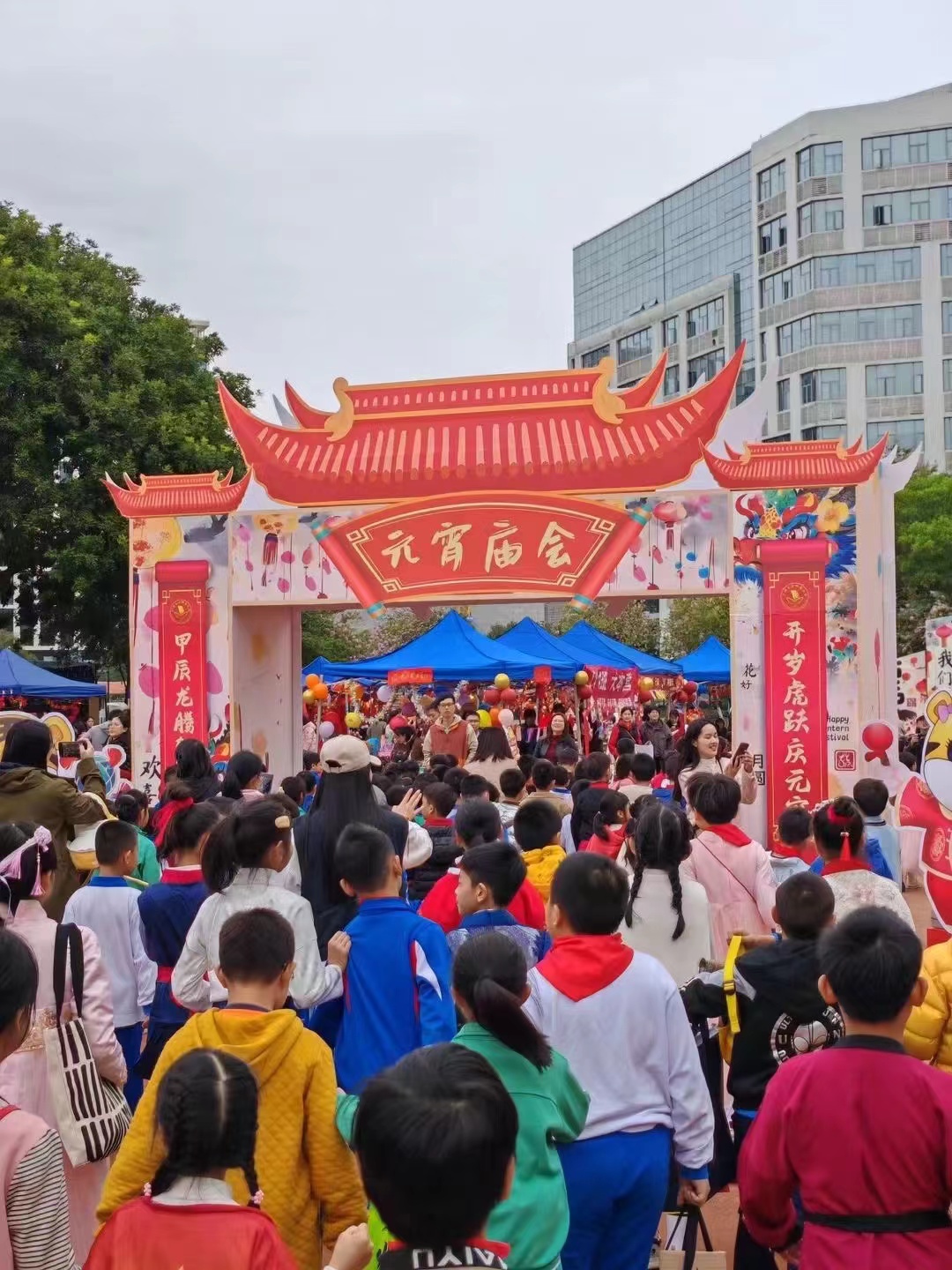 2月23日元宵節前夕,廣州大學附屬小學舉行大型傳統民俗廟會活動,南北兩校區分別開展,參與人數超千人。現場人頭攢擁,年味十足,學生們沉浸式體驗,熱熱鬧鬧逛廟會。