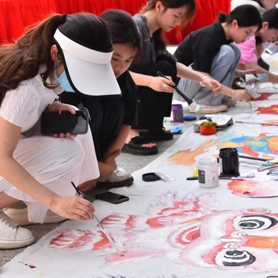 6月12日,嶺南師范學院美術館前鑼鼓震天一片喜慶,金獅歡騰起舞,百米長卷一字鋪開,該校美術與設計學院百名師生現場揮毫繪制多彩 “百獅圖”,助力“遂溪醒獅”IP 形象設計征集,推進文旅高質量發展,助力“百千萬工程”。