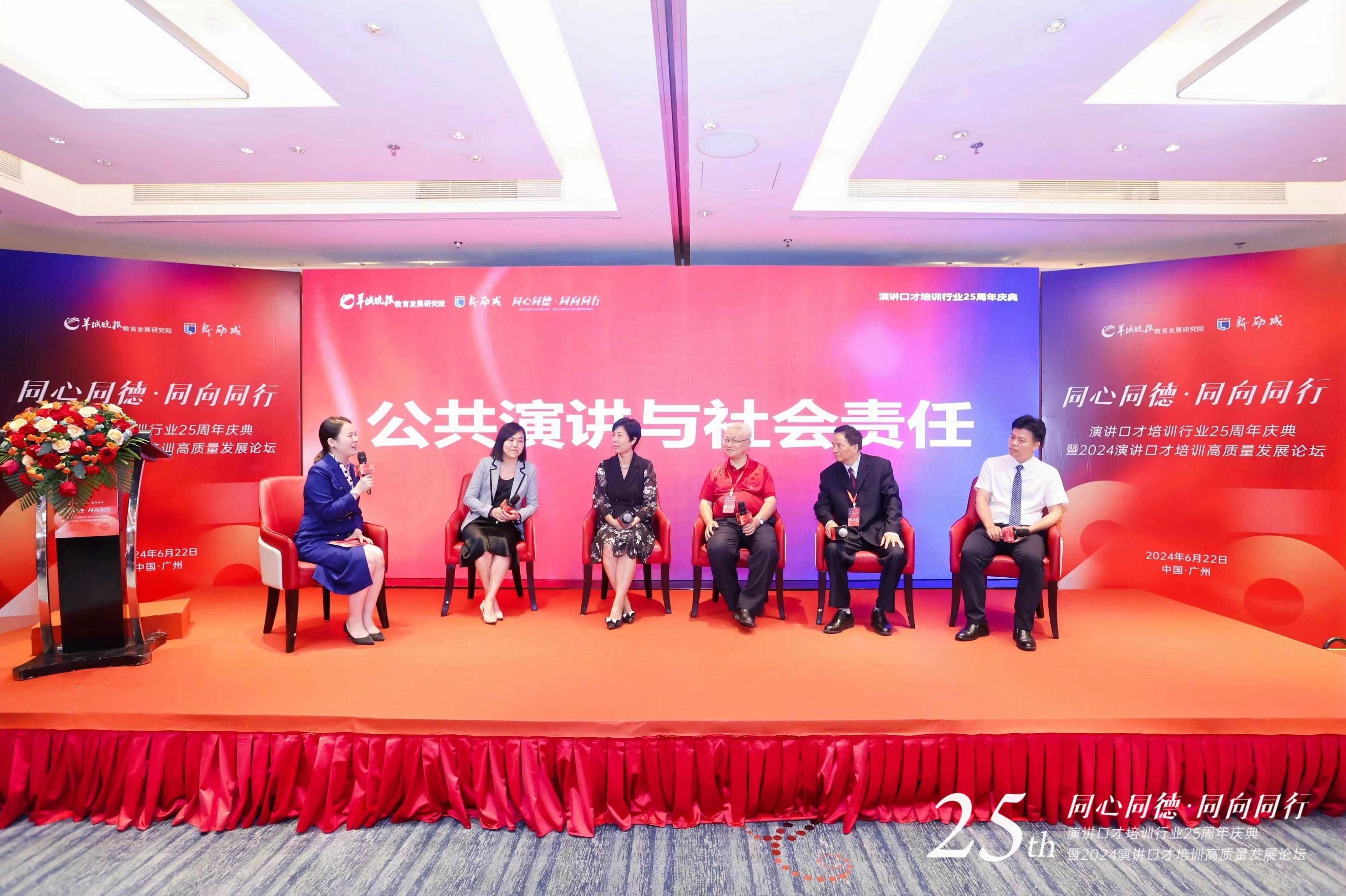 《公共演講與社會責任》議題則探討了演講口才培訓在社會責任方面的作用。新勵成聯合創始人、新勵成慈善基金管理委員會主任、演講口才培訓行業25周年慶典組委會主任劉慧,廣東省紅十字基金會秘書長吳春芳,全國百姓學習之星、順德區演講與口才協會黨支部書記朱新民,湖南省響語演講團團長李梅,佛山市勒竹小學校長蘇振國等人共同強調了演講口才培訓在提升公眾溝通能力、促進社會和諧、傳遞正能量以及教育培養下一代方面的積極作用,從而體現了演講口才培訓行業所承擔的重要社會責任。
