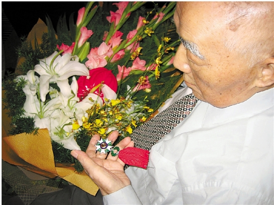 兩年后,當法國政府得知中國還有一位曾參加過諾曼底戰役的老人,決定為黃廷鑫授勛。7月5日,在浙江省外事辦公室大廳,法國駐上海總領事代表法國政府將一枚象征法國最高榮耀的“法蘭西榮譽勛位騎士勛章”戴在黃廷鑫的胸前。88歲的黃廷鑫坐在輪椅上,強撐著病體發言,“此時此刻,我想起了和我一起在歐洲戰場上參戰的二十多位同學,也想起了參加反法西斯戰爭的所有中國人,這一崇高的榮譽不僅屬于我,也屬于他們……”