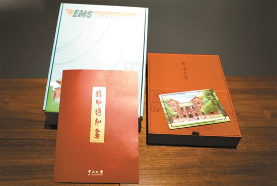 通知書禮盒名為“百年樹人”。盒內不僅有100年前中大辦學校址的圖樣,中大校徽,還有一枚“世紀之門”徽章,用數字“100”的形態匯聚光影。
