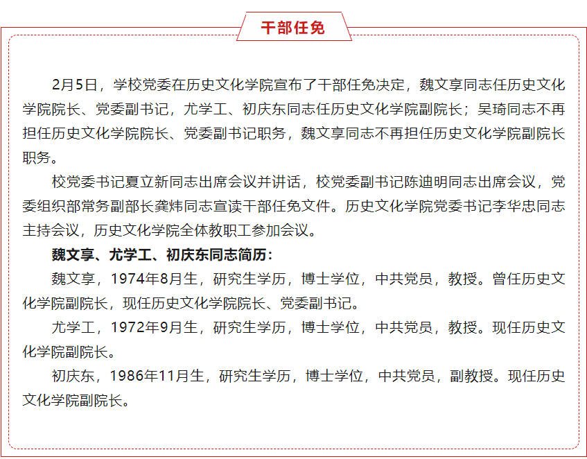2月5日,學校黨委在歷史文化學院宣布了干部任免決定,魏文享同志任歷史文化學院院長、黨委副書記,尤學工、初慶東同志任歷史文化學院副院長;吳琦同志不再擔任歷史文化學院院長、黨委副書記職務,魏文享同志不再擔任歷史文化學院副院長職務。