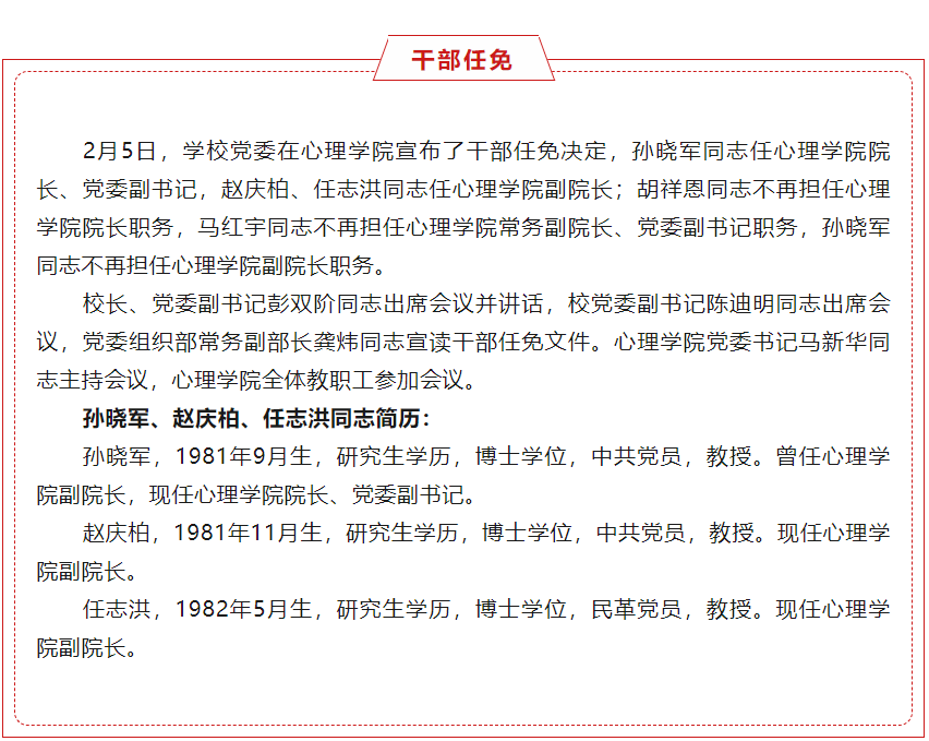 2月5日,學校黨委在心理學院宣布了干部任免決定,孫曉軍同志任心理學院院長、黨委副書記,趙慶柏、任志洪同志任心理學院副院長;胡祥恩同志不再擔任心理學院院長職務,馬紅宇同志不再擔任心理學院常務副院長、黨委副書記職務,孫曉軍同志不再擔任心理學院副院長職務。