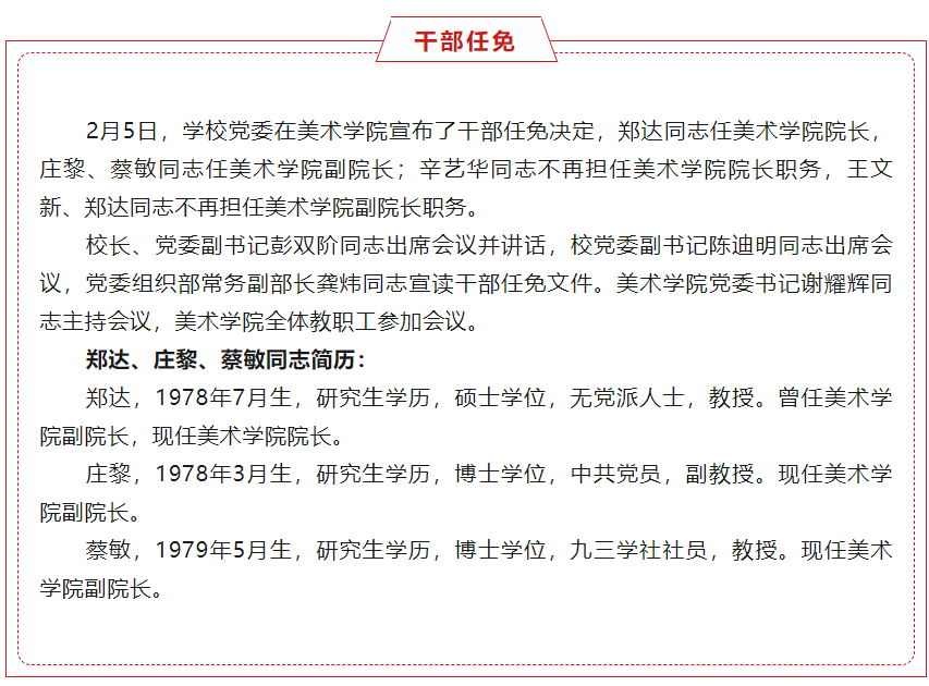 2月5日,學校黨委在美術學院宣布了干部任免決定,鄭達同志任美術學院院長,莊黎、蔡敏同志任美術學院副院長;辛藝華同志不再擔任美術學院院長職務,王文新、鄭達同志不再擔任美術學院副院長職務。