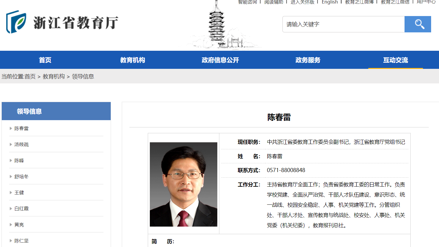 2月7日,據浙江省教育廳官網“領導信息”欄目更新顯示,陳春雷已任浙江省教育廳黨組書記。