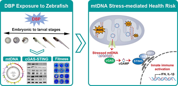 研究發現,DBP暴露斑馬魚胚胎后,可引發線粒體結構損傷與功能障礙,并破壞mtDNA穩定性。DBP暴露導致mtDNA氧化受損并釋放至細胞質,進而通過cGAS-STING信號通路激活先天免疫系統,引發炎癥反應失調及胚胎發育毒性。同時,持續監測斑馬魚胚胎至仔魚階段發育過程,發現DBP暴露下mtDNA損傷介導了線粒體能量代謝紊亂與慢性炎癥,并造成仔魚的運動能力受損等健康風險;而通過緩解線粒體氧化應激及mtDNA損傷后,則可明顯改善仔魚的健康水平。