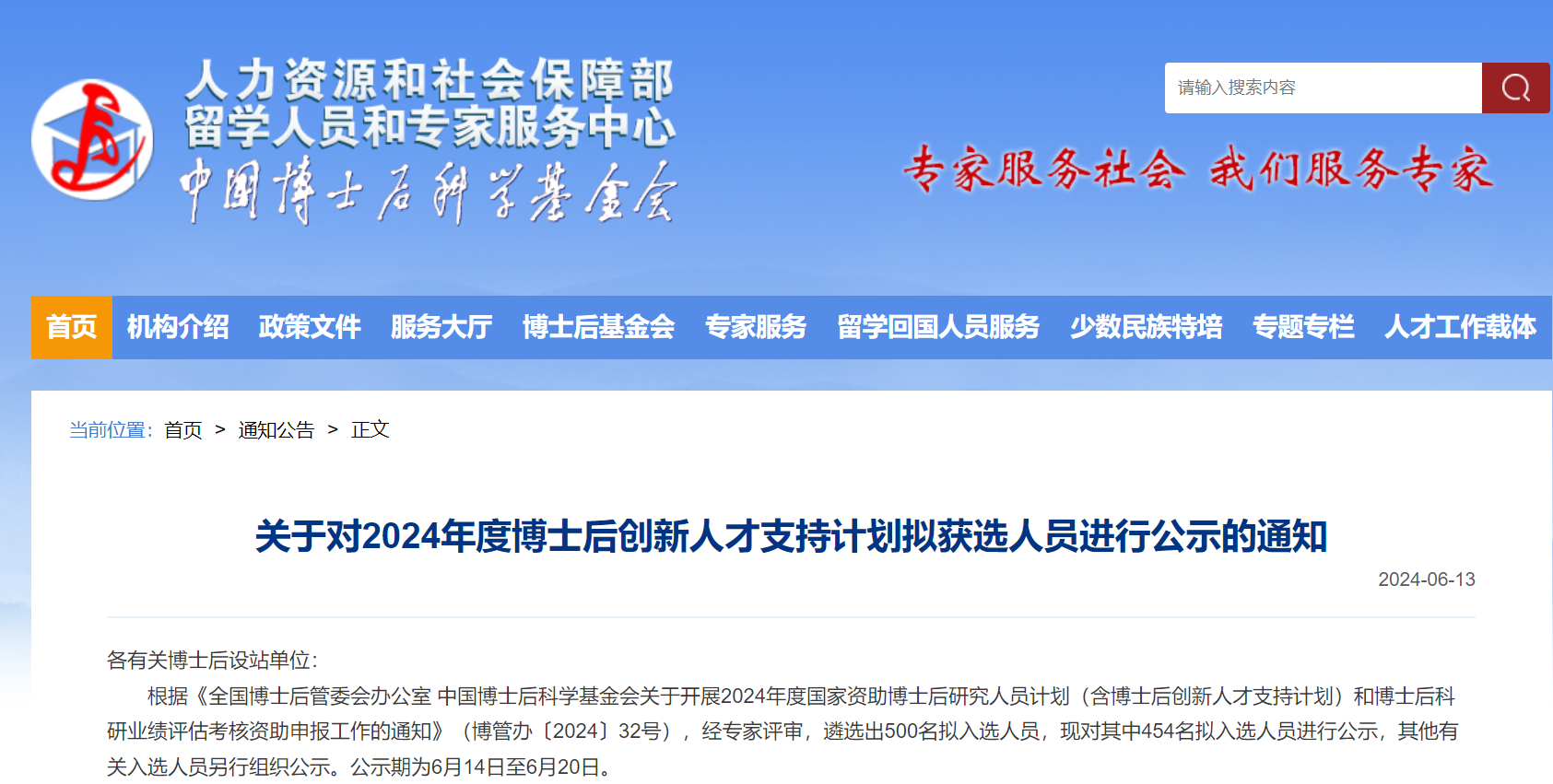 根據《全國博士后管委會辦公室 中國博士后科學基金會關于開展2024年度國家資助博士后研究人員計劃(含博士后創新人才支持計劃)和博士后科研業績評估考核資助申報工作的通知》(博管辦〔2024〕32號),經專家評審,遴選出500名擬入選人員,現對其中454名擬入選人員進行公示,其他有關入選人員另行組織公示。公示期為6月14日至6月20日。