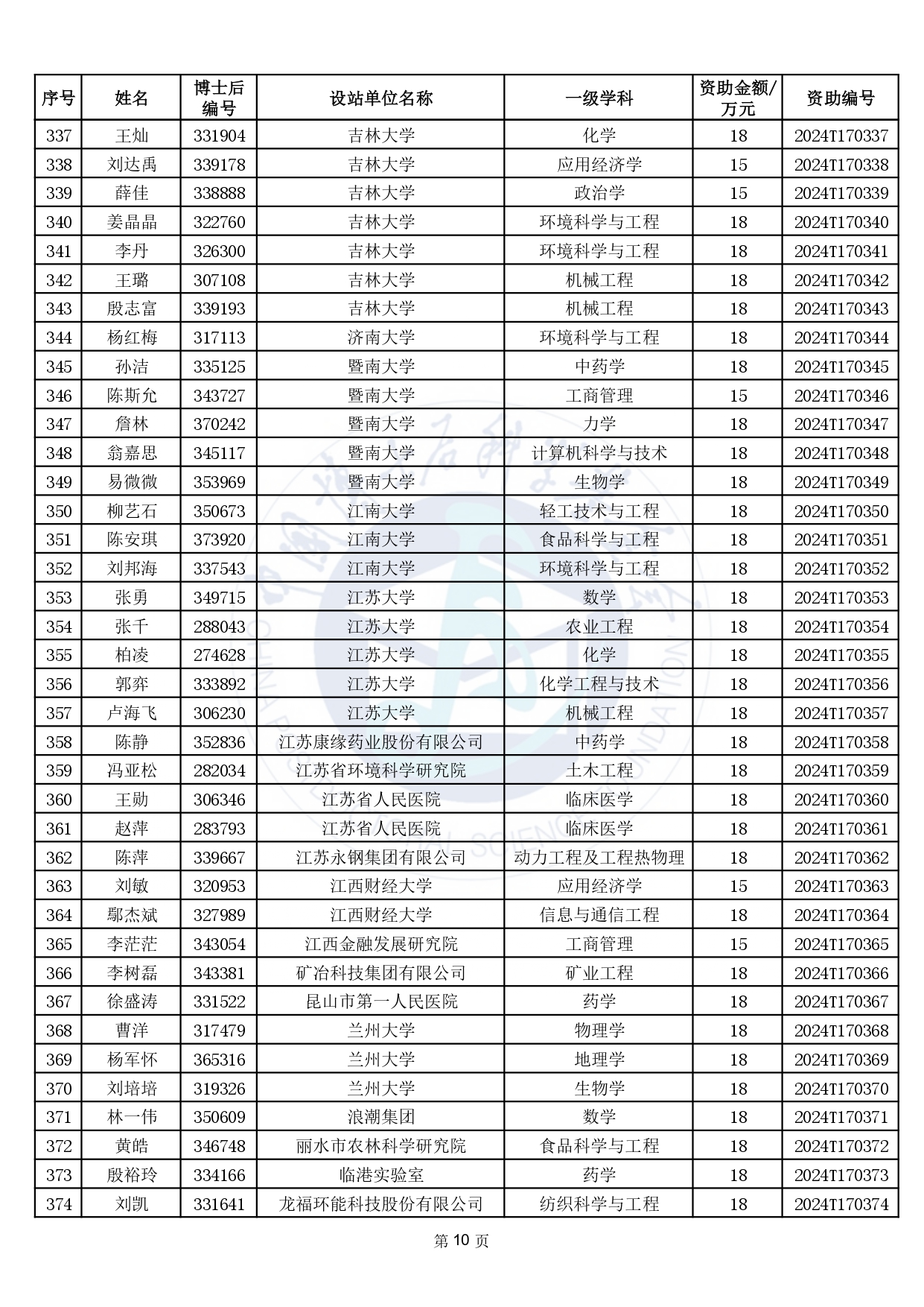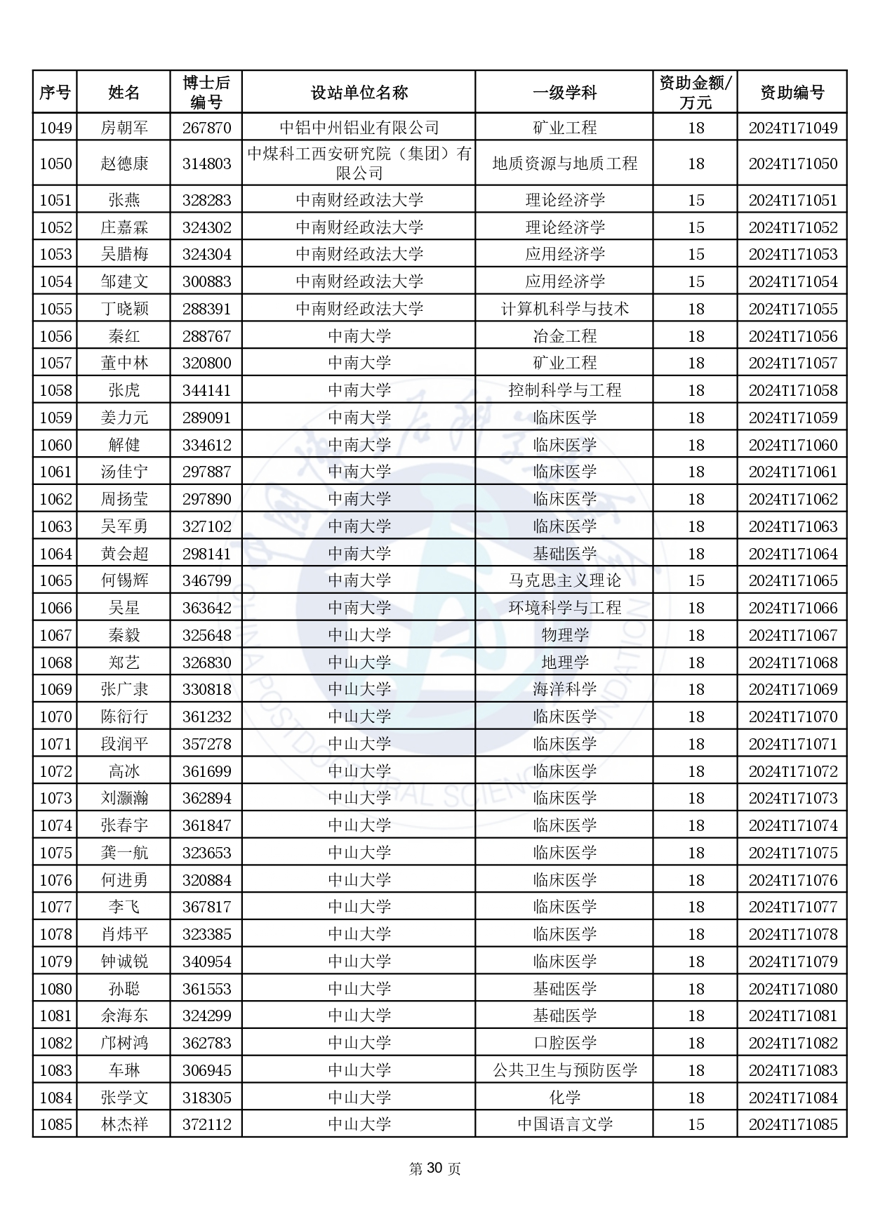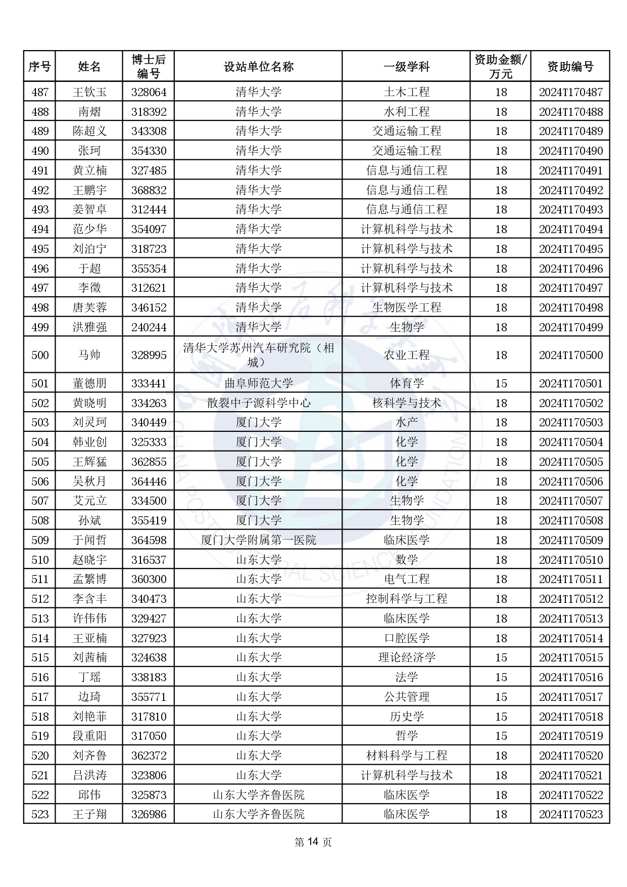 2024年度中國博士后科學基金第17批特別資助獲資助人員名單公布